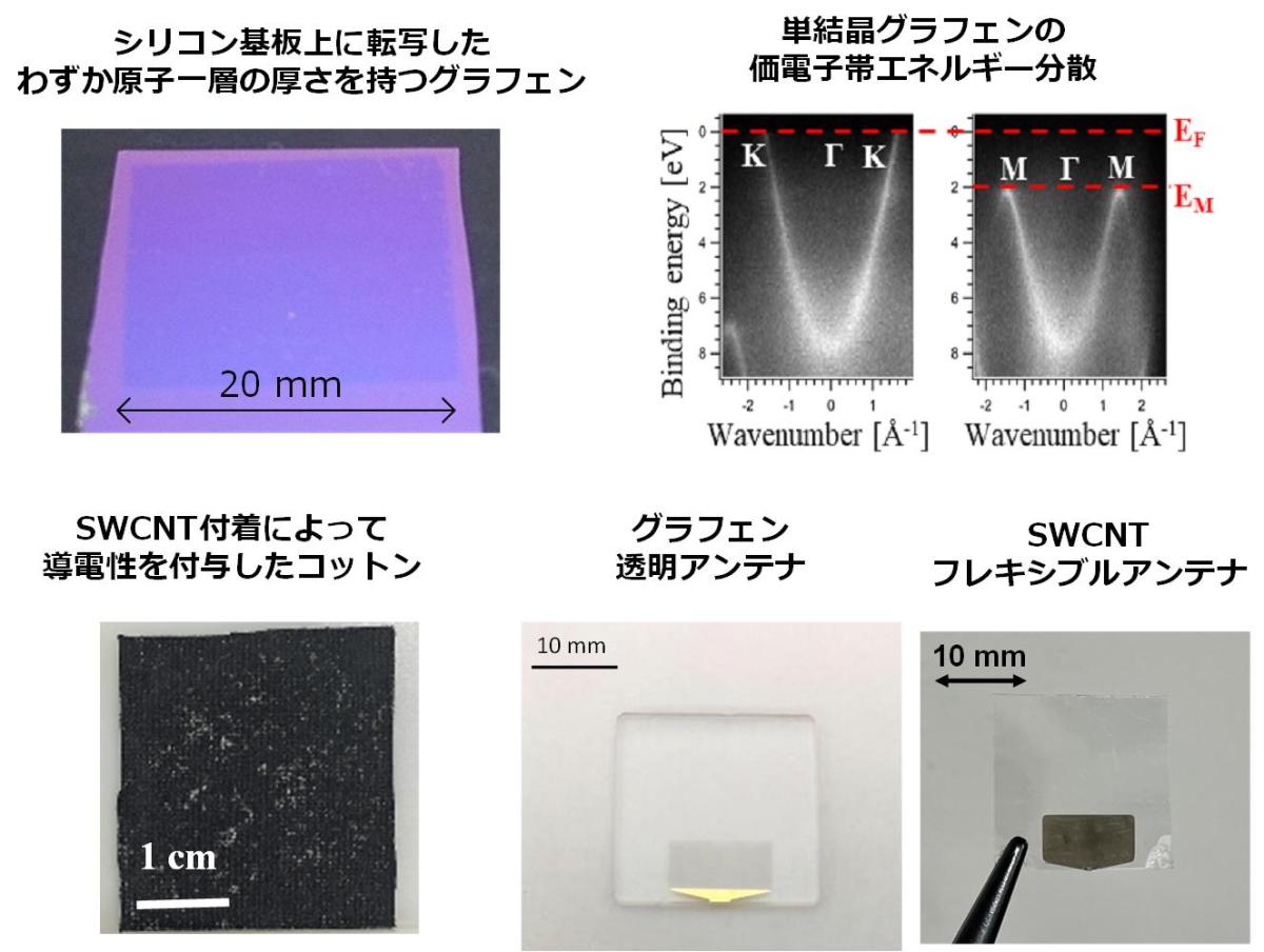 図(上左)シリコン基板に転写した単層グラフェン (上右)光電子分光法によって測定した単結晶単層グラフェンの価電子帯エネルギー分散(下左)SWCNT付着によって導電性を付与したコットン(下中)3層積層CVDグラフェンを用いた透明モノポールアンテナ(下右)SWCNTインクを用いて作製したフレキシブルアンテナ |